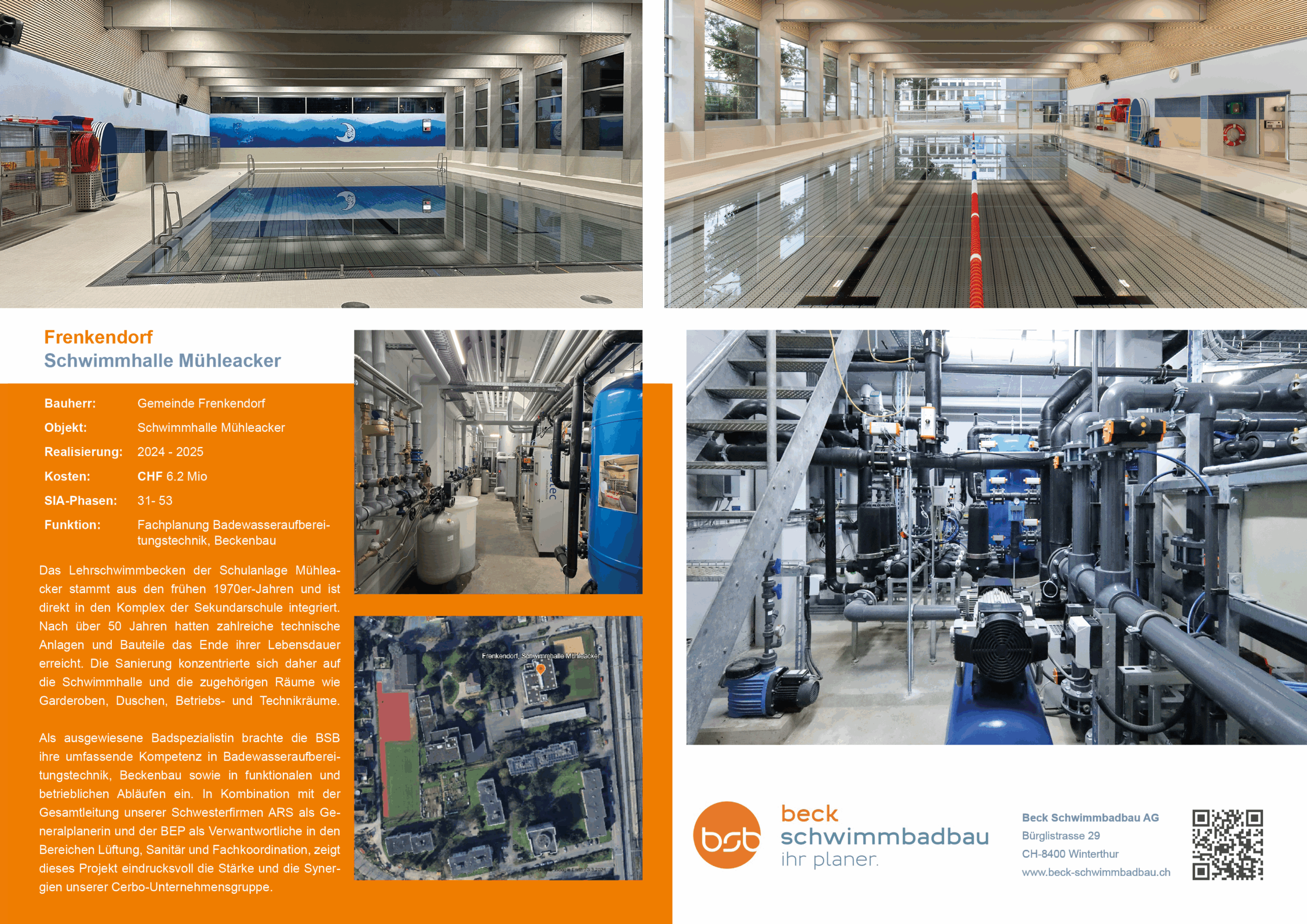 Frenkendorf, Schwimmhalle MühleackerJasmin Beck2025-12-01T11:03:10+00:00 Dürfen wir Sie bei Ihrem Bauprojekt unterstützen? Nehmen Sie mit uns Kontakt auf! Sanierung Schwimmhalle/Lehrschwimmbecken Unsere Projektaufgaben BSB: Sanierung Becken Sanierung Badewasseraufbereitungstechnik ARS: Generalplanung BEP: Lüftungsingenieurwesen Haustechnikkoordination Sanitäringenieurwesen Projektdetails BAUHERR Gemeinde Frenkendorf OBJEKT Schwimmhalle Mühleacker REALISIERUNG 2024 – 2025 KOSTEN CHF 6.2 Mio.