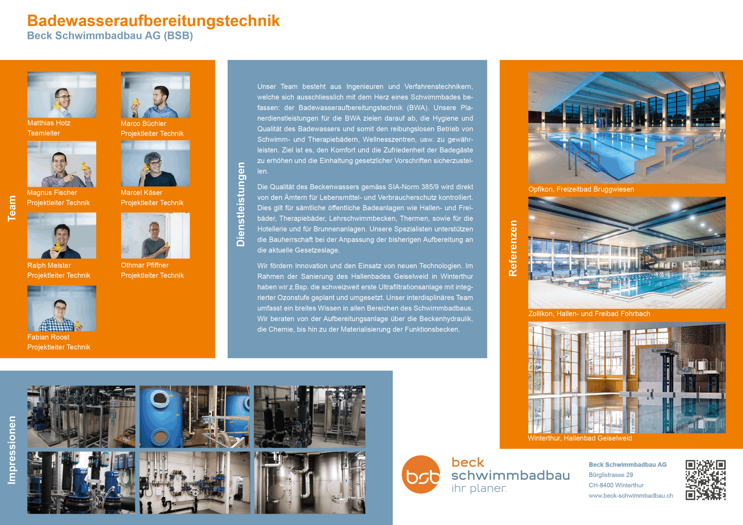 Das Team der Beck Schwimmbadbau AG (BSB) setzt sich aus Spezialisten unterschiedlichster Herkunft zusammen: Architekten, Verfahrenstechniker, Anlagebauer, Immobilienbewirtschafter usw. Damit decken wir die unterschiedlichen Disziplinen ab, um der Vielschichtigkeit eines Schwimmbades zu begegnen. So sind wir in der Lage, die Anforderungen und Herausforderungen des Schwimmbadbaus anzunehmen und in die richtige Richtung zu lenken. Das ist unsere Stärke!